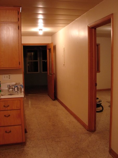 The view from the living room. I was under strict orders not to, under any circumstances, repaint the green cabinet (which is fine, because I would never want to!) -- it is full of weird old kitschy stuff, cookbooks, and baking ingredients. And note the one mismatched kitchen chair! The three red ones were found on the curb in Madison, WI.